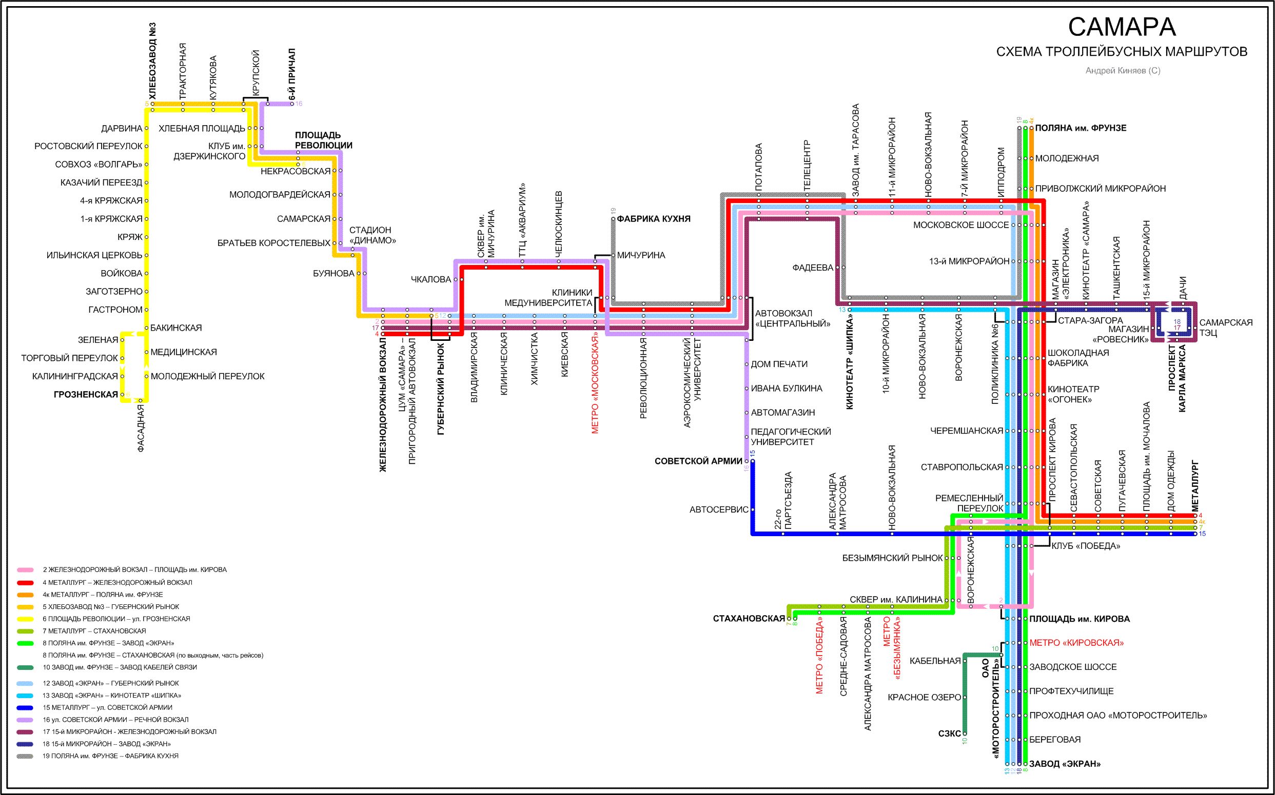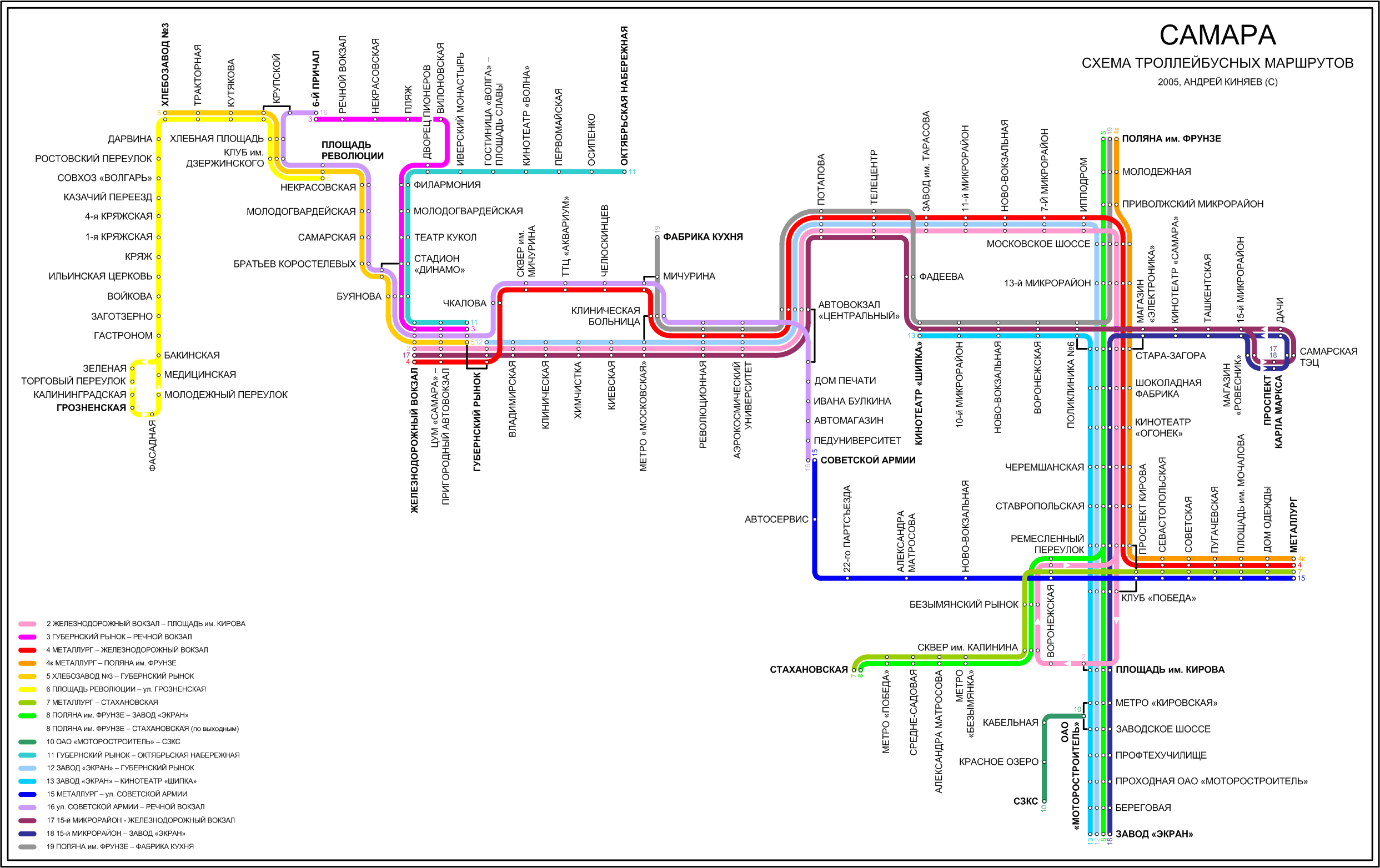 Упрощенная схема троллейбусных маршщрутов, линии и остановки показаны схематично, каждый маршрут имеет свой цвет. Актуальность – сентябрь 2005 г. Размер – 228 кб. Автор – Андрей Киняев.