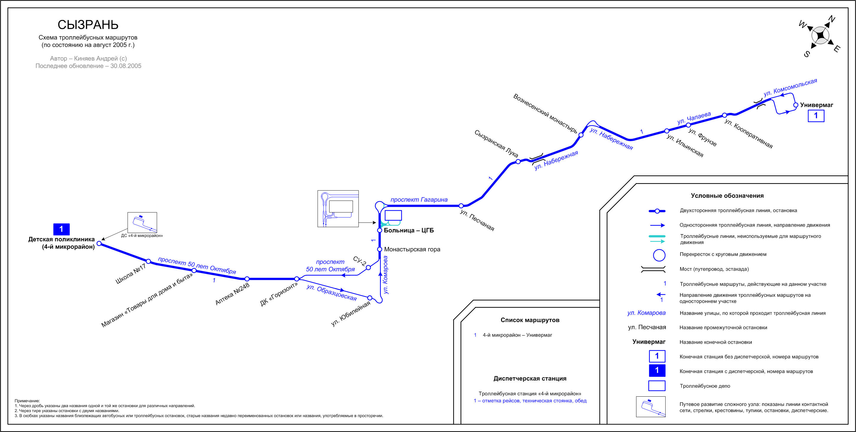 Схема троллейбусных маршрутов. Подробная схема, показаны все линии, остановки, улицы, диспетчерские станции, есть перечень маршрутов. Кроме того, показано путевое развитие сложных нестандартных узлов. Актуальность – август 2005 г. Размер – 135 кб. Автор – Андрей Киняев.