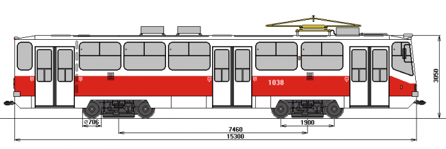 Кузов вагона цельнометаллический, каркасной конструкции. Лицевая часть вагона выполнена с вклеенным панорамным лобовым стеклом, передняя дверь одностворчатая, средняя и задняя двери двухстворчатые. Все двери выполнены шарнирно-поворотными и открываются внутрь салона. Кузов фиксируется на тележках посредством шкворней, приваренных к раме. Тележка безрамной конструкции с внутренним расположением букс. Крутящий момент от каждого из двух тяговых электродвигателей передается на ось колесной пары через карданный вал и двухступенчатый редуктор. Шарниры с резиновыми вкладышами обеспечивают сохранение прямоугольности конструкции при прохождении вертикальных неровностей трамвайного пути. Подвеска вагона и конструкция ходовой тележки обеспечивают гашение вибрации и колебаний, снижают износ путей. Хотя, следует отметить, что вагон в целом чувствителен к плохому пути и жестко проходит спецчасти пути.